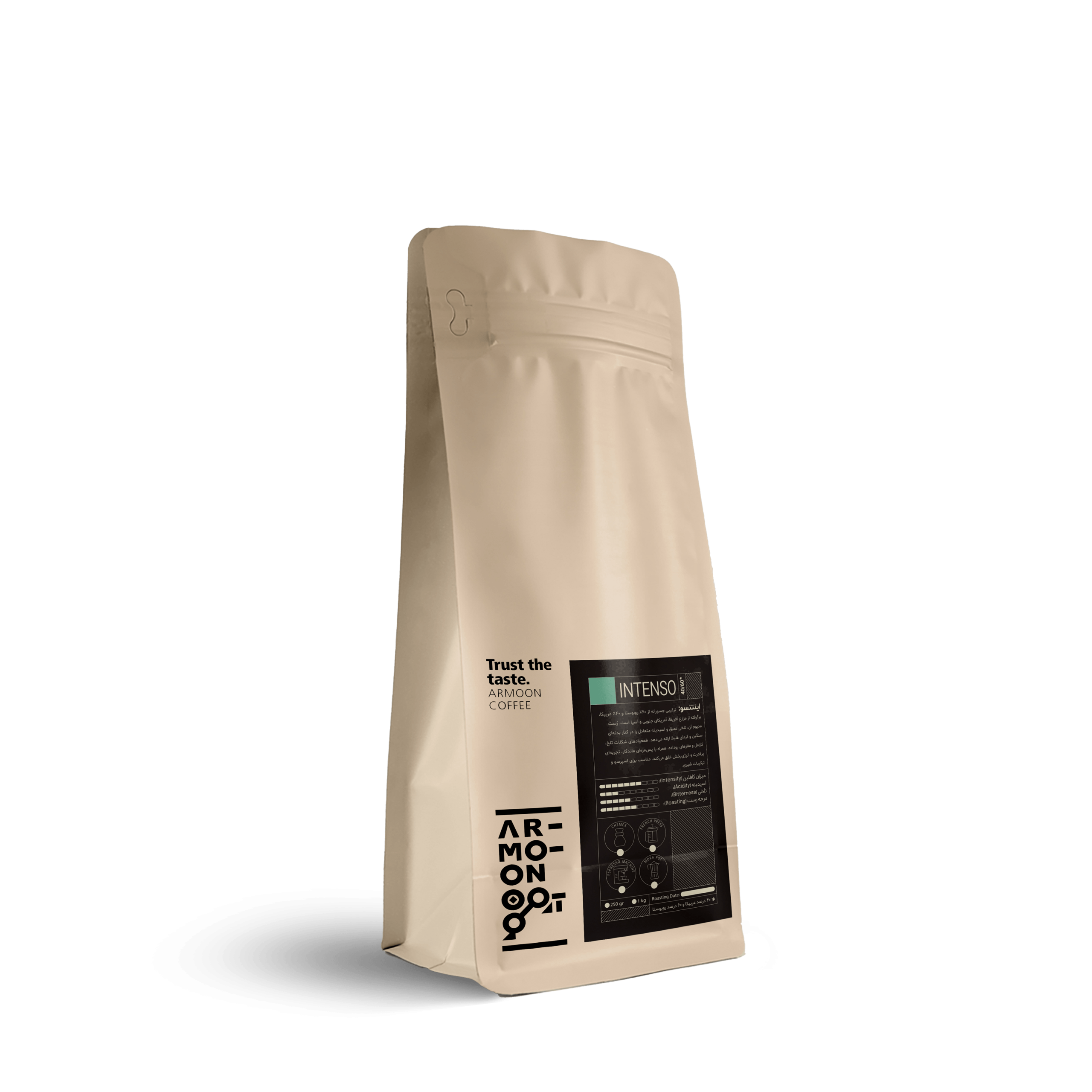 قهوه اینتنسو یکی از پرانرژیترین ترکیبهای برند آرمون است. این قهوه با ۶۰٪ روبوستا و ۴۰٪ عربیکا ساخته شده و طعمی قدرتمند، تلخ و در عین حال متعادل را به شما هدیه میدهد. همانطور که از نامش پیداست، «اینتنسو» یعنی شدت و قدرت؛ بنابراین اگر به دنبال یک اسپرسوی غلیظ با کرمای ضخیم و کافئین بالا هستید، این ترکیب انتخاب شماست.